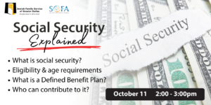 Join us at Jewish Family Service of Greater Dallas for an informative seminar, presented by a John Schnorr from the Society of Financial Awareness (SOFA). Uncover the key insights about Social Security, eligibility, and retirement planning that you need to secure your financial future.