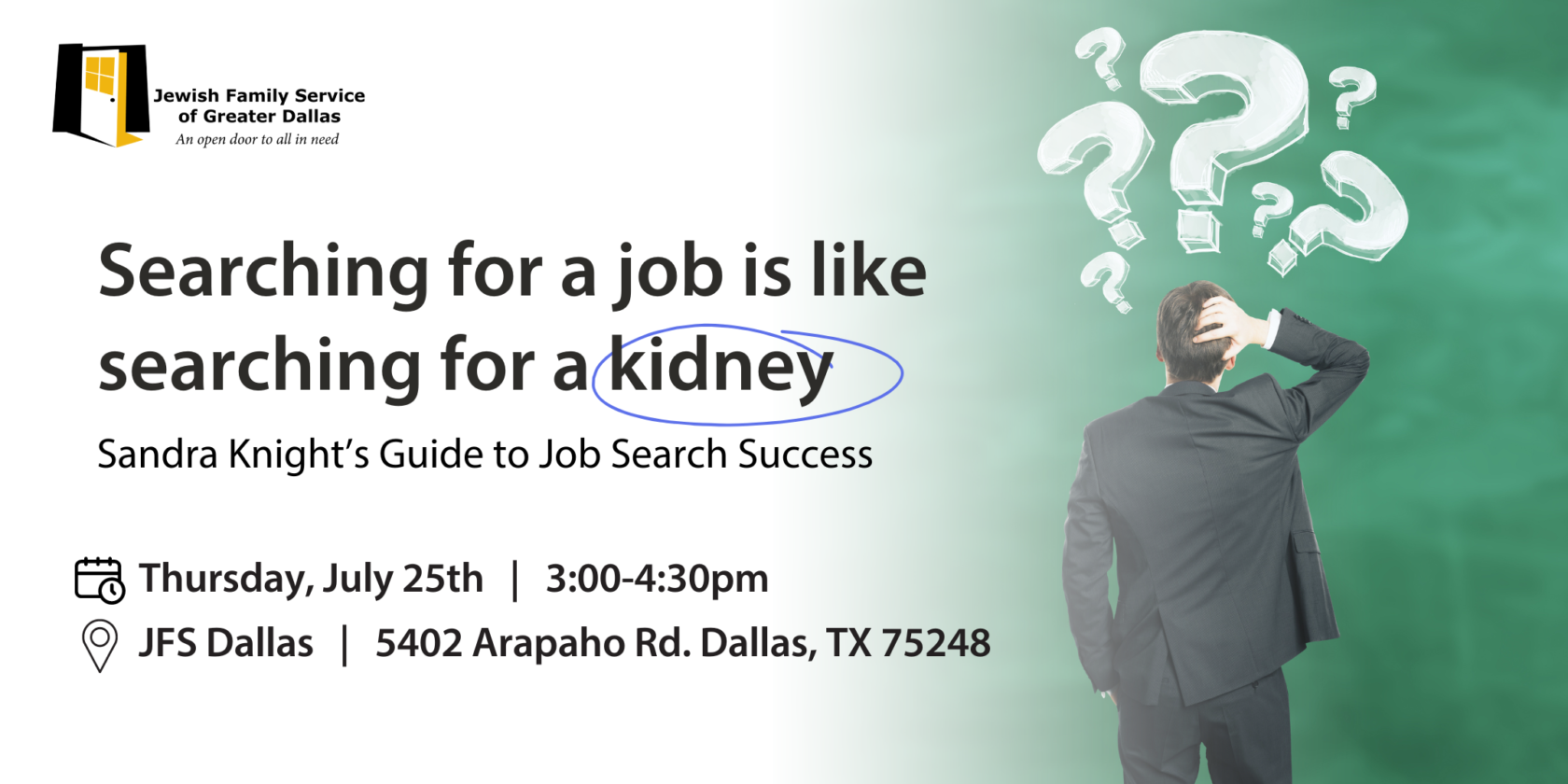 Jul 25 Searching for a Job is Like Searching for a Kidney Featured 3:00 pm - 4:30 pm JFS (5402 Arapaho Road, Dallas 75248) 5402 Arapaho Road, Dallas Event Details Get Directions