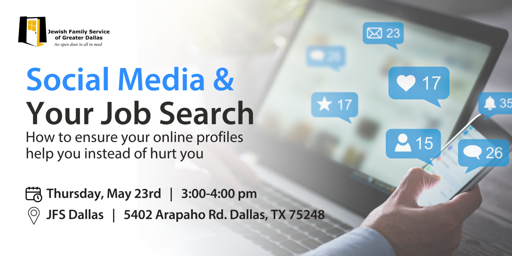 May 23 Social Media and Your Job Search Featured 3:00 pm - 4:00 pm JFS (5402 Arapaho Road, Dallas 75248) 5402 Arapaho Road, Dallas Event Details Get Directions